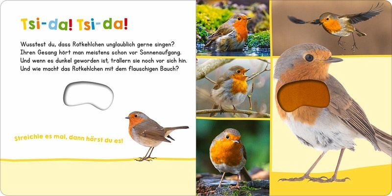 Das Rotkehlchen singt, der Storch klappert und der Spatz tschirpt fröhlich. Doch wie klingen der Specht und die Amsel? Hier kannst du es entdecken. Einfach über das kuschelweiche Gefieder der Tiere streicheln und schon wird die Vogelwelt lebendig. Das Fühlbuch mit vielen hochwertigen Fotos und Soundmodulen begeistert schon die Kleinsten und macht das gemeinsame Vorlesen zum interaktiven Erlebnis für alle Sinne.