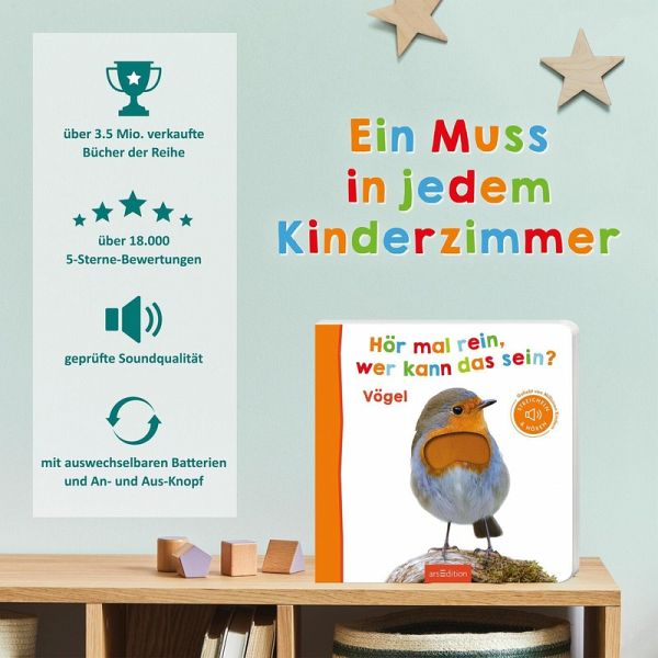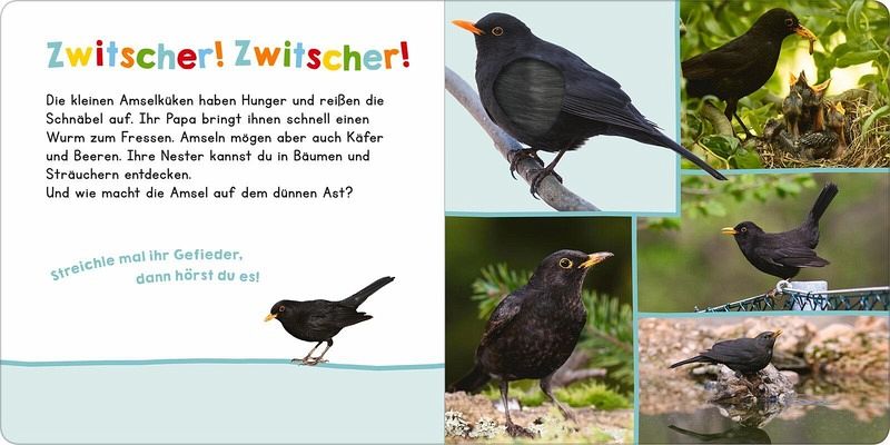 Auf jeder Doppelseite wird ein heimischer Vogel mit vielen anschaulichen Fotos und einem kurzen Sachtext vorgestellt. Das weiche Fell lädt zum Fühlen ein und beim Darüberstreicheln wird das passende Tiergeräusch ausgelöst. Das ist nicht nur spannend, sondern fördert auch die Hand-Auge-Koordination, die Lautbildung und das Sprechen. Das Fühlbuch mit Sound eignet sich für Kinder ab 6 Monaten.