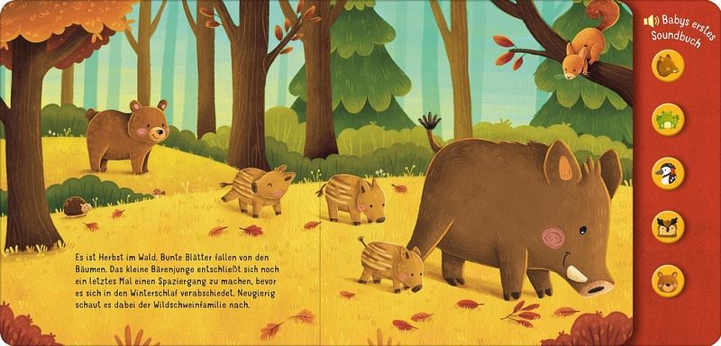 Auf den 5 liebevoll illustrierten Doppelseiten gibt es jede Menge Waldtiere zu entdecken. Die Soundbuttons auf der Leiste am rechten Rand sind babyleicht auslösbar und sorgen für erste Erfolgserlebnisse bei den Allerkleinsten ab 6 Monaten. Durch die Suche nach dem passenden Tier sorgt das Pappbilderbuch für Interaktion zwischen Groß und Klein und bringt ersten Wimmelspaß mit sich.