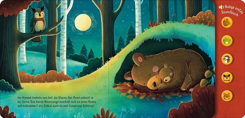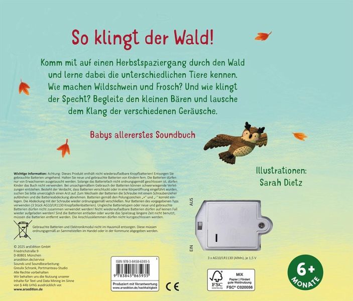 Soundbuch mit Erzähltext: Der kleine Bär führt von Szene zu Szene und von Tier zu Tier. So wird der Wald lebendigMit 5 leicht auszulösenden Soundmodulen für kleine Kinderhände: Die Geräusche lassen sich kinderleicht aktivierenAtmosphärische Melodien: Die hochwertigen Geräusche machen die Geschichte lebendig und laden zum Träumen einTon abschaltbar: Dank des praktischen An- und Ausschalters auf der Buchrückseite lassen sich die Geräusche ein- und ausschaltenBatterien auswechselbar: Das Buch enthält handelsübliche Knopfzellenbatterien vom Typ LR 1130 mit je 1,5 V, die sich problemlos auswechseln lassenGeprüfte Qualität von Anfang an: Das Buch unterliegt strengen Sicherheitsanforderungen und regelmäßigen Qualitätskontrollen nach europäischer Spielzeugsicherheitsrichtlinie