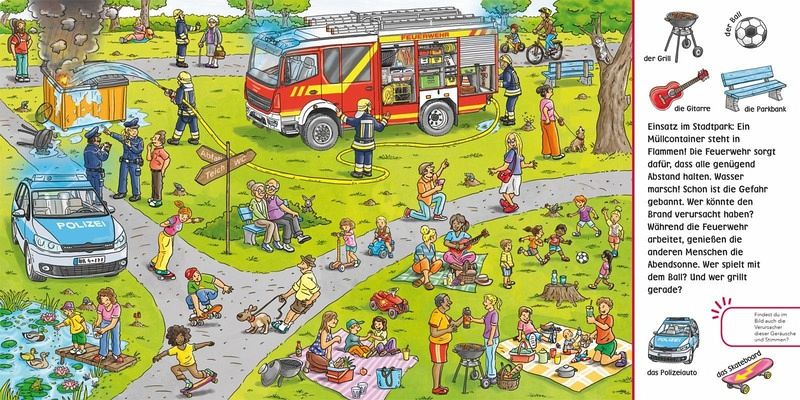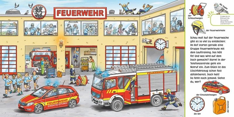 All das und noch viel mehr können die Kinder in sechs unterschiedlichen Einsatzszenen und in großen detailreichen Bildern wiederfinden. Durch kurze Vorlesetexte kann das Buch außerdem als Bilderbuch gelesen werden. Da kommt keine Langeweile auf!