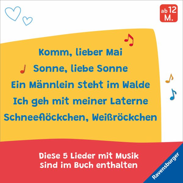 Fünf Kinderlieder erklingen wie durch Zauberei wenn die Seiten aufgeschlagen werden. So können schon Einjährige ihr Lieblingslied selbst aussuchen und ohne Hilfe anhören. "Komm, lieber Mai und mache", "Sonne, liebe Sonne", "Ein Männlein steht im Walde", "Ich geh mit meiner Laterne" und "Schneeflöckchen, Weißröckchen" sind für Kleinkinder der ideale musikalische Begleiter durch das ganze Jahr.