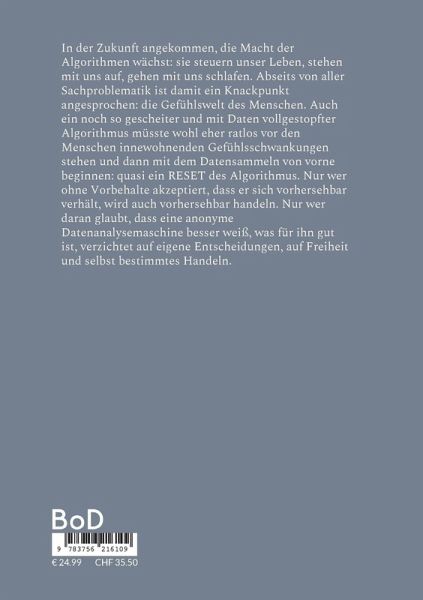 In der Zukunft angekommen, die Macht der Algorithmen wächst: sie steuern unser Leben, stehen mit uns auf, gehen mit uns schlafen. Abseits von aller Sachproblematik ist damit ein Knackpunkt angesprochen: die Gefühlswelt des Menschen. Auch ein noch so gescheiter und mit Daten vollgestopfter Algorithmus müsste wohl eher ratlos vor den Menschen innewohnenden Gefühlsschwankungen stehen und dann mit dem Datensammeln von vorne beginnen: quasi ein RESET des Algorithmus. Nur wer ohne Vorbehalte akzeptiert, dass er sich vorhersehbar verhält, wird auch vorhersehbar handeln. Nur wer daran glaubt, dass eine anonyme Datenanalysemaschine besser weiß, was für ihn gut ist, verzichtet auf eigene Entscheidungen, auf Freiheit und selbst bestimmtes Handeln.