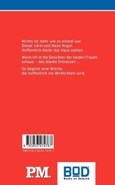 Nichts ist mehr wie es einmal war. Dieser Lärm und diese Angst.Hoffentlich bleibt das Haus stehen. Wenn ich in die Gesichter der beiden Frauen schaue - das blanke Entsetzen ... So beginnt eine Woche, die hoffentlich nie Wirklichkeit wird.