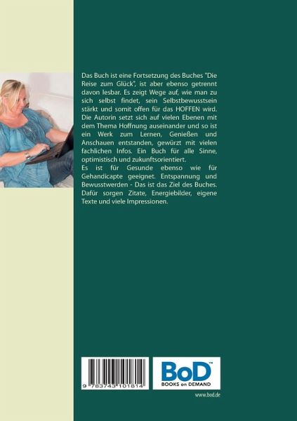 Das Buch ist eine Fortsetzung des Buches "Die Reise zum Glück", ist aber ebenso getrennt davon lesbar. Es zeigt Wege auf, wie man zu sich selbst findet, sein Selbstbewusstsein stärkt und somit offen für das HOFFEN wird. Die Autorin setzt sich auf vielen Ebenen mit dem Thema Hoffnung auseinander und so ist ein Werk zum Lernen, Genießen und Anschauen entstanden, gewürzt mit vielen fachlichen Infos. Ein Buch für alle Sinne, optimistisch und zukunftsorientiert.Es ist für Gesunde ebenso wie für Gehandicapte geeignet. Entspannung und Bewusstwerden - Das ist das Ziel des Buches. Dafür sorgen Zitate, Energiebilder, eigene Texte und viele Impressionen.