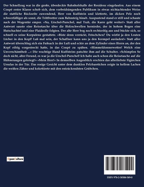 Der Schnellzug war in die große, überdeckte Bahnhofshalle der Residenz eingelaufen. Aus einem Coupé erster Klasse schob sich, dem vorbeidrängenden Publikum in etwas nichtachtender Weise die stattliche Rückseite zuwendend, Herr von Kuffstein und kletterte, im dicken Pelz noch schwerfälliger als sonst, die Trittbretter zum Bahnsteig hinab. Auspustend stand er still und schaute nach der Wagentür empor. »Na, Urschel-Purschel, mal Trab, die Karre geht weiter!« Statt aller Antwort sauste eine Reisetasche über die Holzschwellen hernieder, der in hohem Bogen eine Hutschachtel und eine Plaidrolle folgten. Der alte Herr bog noch rechtzeitig aus und bückte sich, so schnell es seine Korpulenz gestattete. »Biste denn verrückt, Fröschchen? Du wirfst ja den Leuten Löcher in den Kopf! Laß mal sein, der Schaffner kann uns ja den Krempel ausladen!« Statt aller Antwort überschlug sich ein Fußsack in der Luft und eckte an dem Zylinder eines Herrn an, der den Kopf eifrig vorgestreckt hatte, in das Coupé zu spähen. »Himmeldonnerwetter! Welch eine Unverschämtheit ...« Die wuchtige Hand Kuffsteins patschte ihm auf die Schulter. »Schimpfen Se doch nicht, alter Freund, es war ja die Urschel-Purschel! Ich habe auch schon die Reisetasche auf die Hühneraugen gekriegt!« »Mein Herr!« In demselben Augenblick erschien das allerliebste Figürchen Ursulas in der Tür. Das rosige Gesicht unter dem dunklen Pelzbarettchen zeigte in hellem Lachen die weißen Zähne und kokettierte mit den entzückendsten Grübchen.