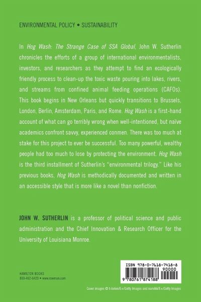 Hog Wash chronicles the efforts of a group of international environmentalists, investors, and researchers as they attempt to find an ecologically friendly process to clean-up the toxic waste pouring into lakes, rivers, and streams from confined animal feeding operations (CAFOs). This book begins in New Orleans but quickly transitions to Brussels, London, Berlin, Amsterdam, Paris, and Rome. Hog Wash is a first-hand account of what can go terribly wrong when well-intentioned, but naïve academics confront savvy, experienced conmen. There was too much at stake for this project to ever be successful. Too many powerful, wealthy people had too much to lose by protecting the environment. Hog Wash is the third installment of John W. Sutherlin's 'environmental trilogy'. Like his previous books, Hog Wash is methodically documented and written in an accessible style that is more like a novel than nonfiction.