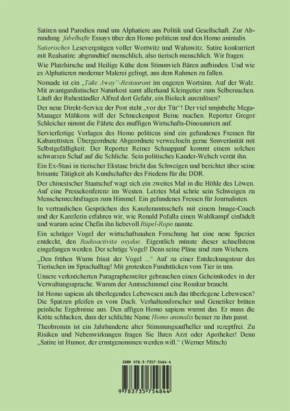 Satiren und Parodien rund um Alphatiere aus Politik und Gesellschaft. Zur Ab-rundung fabelhafte Essays über den Homo politicus und den Homo animalis. Satierisches Lesevergnügen voller Wortwitz und Wahnwitz. Satire konkurriert mit Realsatire: abgrundtief menschlich, also tierisch menschlich. Wir fragen:Wie Platzhirsche und Heilige Kühe dem Stimmvieh Bären aufbinden. Und wie es Alphatieren moderner Malerei gelingt, aus dem Rahmen zu fallen.Nomade ist ein "Take Away"-Restaurant im engeren Wortsinn. Auf der Walz. Mit avantgardistischer Naturkost samt allerhand Kleingetier zum Selbersuchen. Läuft der Ruheständler Alfred dort Gefahr, ein Bioleck auszulösen?Der neue Direkt-Service der Post steht "vor der Tür"! Der viel umjubelte Mega-Manager Mähkorn will der Schneckenpost Beine machen. Reporter Gregor Schleicher nimmt die Fährte des muffigen Wirtschafts-Dinosauriers auf.Servierfertige Vorlagen des Homo politicus sind ein gefundenes Fressen für Kabarettisten. Übergeordnete Abgeordnete verwechseln gerne Souveränität mit Selbstgefälligkeit. Der Reporter Reiner Schnappauf kommt einem solchen schwarzen Schaf auf die Schliche. Sein politisches Kauder-Welsch verrät ihn.Ein Ex-Stasi in tierischer Ekstase bricht das Schweigen und berichtet über seine brisante Tätigkeit als Kundschafter des Friedens für die DDR.Der chinesischer Staatschef wagt sich ein zweites Mal in die Höhle des Löwen. Auf eine Pressekonferenz im Westen. Letztes Mal schrie sein Schweigen zu Menschenrechtsfragen zum Himmel. Ein gefundenes Fressen für Journalisten.In vertraulichen Gesprächen des Kanzleramtsschefs mit einem Image-Coach und der Kanzlerin erfahren wir, wie Ronald Pofalla einen Wahlkampf einfädelt und warum seine Chefin ihn liebevoll Rüpel-Ropo nannte.Ein schräger Vogel der wirtschaftsnahen Forschung hat eine neue Spezies entdeckt, den Radioactivita oxydae. Eigentlich müsste dieser schnellstens eingefangen werden. Der schräge Vogel! Denn seine Pläne sind zum Wiehern."Den frühen Wurm frisst der Vogel ..." Auf zu einer Entdeckungstour des Tierischen im Sprachalltag! Mit grotesken Fundstücken vom Tier in uns.Unsere verknöcherten Paragraphenreiter gebrauchen einen Geheimkodex in der Verwaltungssprache. Warum der Amtsschimmel eine Rosskur braucht. Ist Homo sapiens als überlegendes Lebewesen auch das überlegene Lebewesen? Die Spatzen pfeifen es vom Dach. Verhaltensforscher und Genetiker brüten peinliche Ergebnisse aus. Den affigen Homo sapiens wurmt das. Er muss die Kröte schlucken, dass der schlichte Name Homo animalis besser zu ihm passt.Theobromin ist ein Jahrhunderte alter Stimmungsaufheller und rezeptfrei. Zu Risiken und Nebenwirkungen fragen Sie Ihren Arzt oder Apotheker! Denn "Satire ist Humor, der ernstgenommen werden will." (Werner Mitsch)