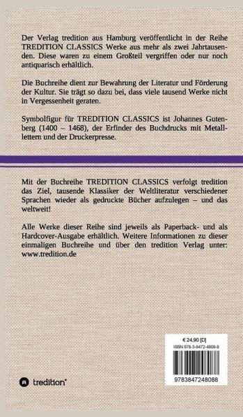 Diese Hardcover-Ausgabe ist Teil der TREDITION CLASSICS. Der Verlag tredition aus Hamburg veröffentlicht in der Buchreihe TREDITION CLASSICS Werke aus mehr als zwei Jahrtausenden. Diese waren zu einem Großteil vergriffen oder nur noch antiquarisch erhältlich. Mit TREDITION CLASSICS verfolgt tredition das Ziel, tausende Klassiker der Weltliteratur verschiedener Sprachen wieder als gedruckte Bücher zu verlegen und das weltweit! Die Buchreihe dient zur Bewahrung der Literatur und Förderung der Kultur. Sie trägt so dazu bei, dass viele tausend Werke nicht in Vergessenheit geraten.