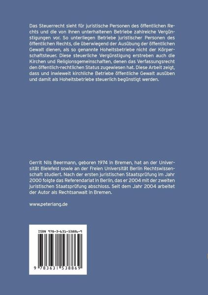 Das Steuerrecht sieht für juristische Personen des öffentlichen Rechts und die von ihnen unterhaltenen Betriebe zahlreiche Vergünstigungen vor. So unterliegen Betriebe juristischer Personen des öffentlichen Rechts, die überwiegend der Ausübung der öffentlichen Gewalt dienen, als so genannte Hoheitsbetriebe nicht der Körperschaftsteuer. Diese steuerliche Vergünstigung erstreben auch die Kirchen und Religionsgemeinschaften, denen das Verfassungsrecht den öffentlich-rechtlichen Status zugewiesen hat. Diese Arbeit zeigt, dass und inwieweit kirchliche Betriebe öffentliche Gewalt ausüben und damit als Hoheitsbetriebe steuerlich begünstigt werden.