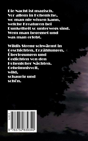 Die Nacht ist magisch. Vor allem in Hohenlohe, wo man nie wissen kann, welche Kreaturen bei Dunkelheit so unterwegs sind. Wem man begegnet und was man erlebt. Wildis Streng schwärmt in Geschichten, Erzählungen, Überlegungen und Gedichten von den Hohenloher Nächten. Geheimnisvoll, wild, schaurig und schön.