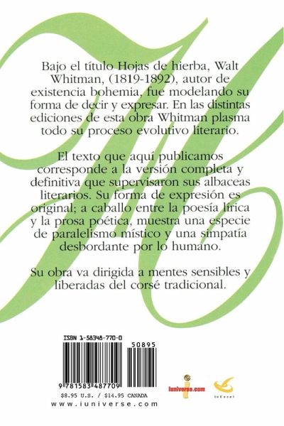 Hojas de hierba, publicada en 1855, es un libro de poemas del poeta estadounidense Walt Whitman. Entre los textos están: Canto de mí mismo, Yo canto al cuerpo eléctrico, De la cuna que se mece eternamente y, en las posteriores ediciones, la elegía al asesinado presidente Abraham Lincoln. El autor de Hojas de hierba, Walt Whitman, nació en el año 1819 en Nueva York, Estados Unidos y es considerado de forma unánime el máximo poeta estadounidense, es el supremo cantor del Yo y de la naturaleza, del cuerpo y del alma, de la igualdad del hombre y la mujer, de la fraternidad y la democracia. Los poemas de Hojas de hierba están conectados entre sí, cada uno representando la celebración de Whitman de su filosofía de la vida y de la humanidad. Este libro se caracteriza por su alegría y alabanza de los sentidos en un momento en el que las manifestaciones en primera persona y la expresión del uno mismo se consideraba inmoral.