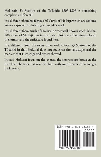 Hokusai's 53 Stations of the T¿kaid¿ 1805-1806 is something completely different! It is different from his famous 36 Views of Mt Fuji, which are sublime artistic expressions distilling a long life's work. It is different from much of Hokusai's other well known work, like his 100 Views of Mt Fuji. But in that series Hokusai still retained a lot of the humor and the caricature found here. It is different from the many other well known 53 Stations of the T¿kaid¿ in that Hokusai does not focus on the landscape and the markers that Hiroshige and others showed. Instead Hokusai focus on the events, the interactions between the travellers, the tales that you will share with your friends when you get back home.