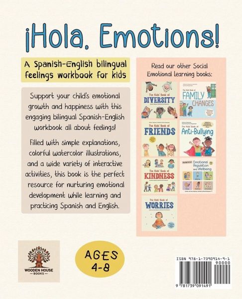 Support your child's emotional growth and happiness with this engaging bilingual feelings workbook! Featuring gentle messages, beautiful watercolor illustrations, thought-provoking questions and interactive activities, this workbook is the ultimate resource for nurturing children's emotional growth and happiness while they learn Spanish and English. Fun and memorable learning: Boost your child's language skills and cognitive development with our bilingual format and child-friendly activities. Emotional awareness: Teach your child to recognize and express their emotions by listening to their bodies and understanding their feelings. Build their emotional vocabulary in both Spanish and English. Colorful, easy-to-use and engaging: Filled with vibrant pictures, fun games and hands-on projects that make learning exciting and interactive. Empathy building: Help your child understand others' emotions, enhancing their communication and social skills. Positive self-esteem: Foster a positive self-identity and self-image in your child through our supportive and encouraging activities. Ideal for ages 4 to 8: Perfect for parents, carers, teachers, and professionals looking to support children's emotional development and bilingual learning. ¡Apoya el crecimiento emocional y la felicidad de los niños con este libro interactivo y educativo bilingüe español-inglés! Conciencia Emocional: Los niños aprenden a escuchar a su cuerpo, identificar sus emociones a través de las sensaciones corporales y expresarlas, así como ampliar su vocabulario emocional tanto en español como en inglés. Actividades: Las actividades van desde redactar, dibujar, juegos y proyectos hasta técnicas de relajación como mindfulness. Aprendizaje divertido y fácil de recordar: El formato interactivo y las actividades centradas en los niños que hacen que el aprendizaje de idiomas y el desarrollo emocional sean amenos y efectivos. Fomenta la empatía: Desarrolla la comprensión de las emociones de los demás a la vez que mejora las habilidades sociales y comunicativas. Idóneo para edades de 4 a 8 años: Esta guía ilustrada es perfecta para padres, cuidadores, maestros y profesionales que buscan apoyar el desarrollo emocional y el aprendizaje bilingüe de los niños. Con mensajes cuidados, coloridas ilustraciones a acuarela, preguntas, reflexiones y una gran variedad de actividades, este libro es el recurso perfecto para fomentar el crecimiento emocional y la felicidad de los niños mientras aprenden español e inglés.