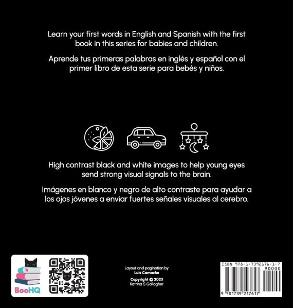 Your child's first bilingual book! Our high-contrast book in English and Spanish is specially designed to engage and stimulate your child's developing senses, promoting early brain development and aiding their ability to recognise shapes and words. Plus, they'll learn simple phrases and have fun playing peek-a-boo! Reading with your child at bedtime is a cherished ritual for parents and their little ones. That's why we made sure that the large text print in our book is easy to read in gentle light. This makes it suitable for a soothing and comfortable bedtime book. You and your child will start a ritual of quality time together, creating memories that last a lifetime. According to studies, an early introduction to books and storytelling can improve children's language skills, foster their imagination, and build their emotional intelligence. By reading together, you'll strengthen the bond between you and your child and provide an opportunity for communication and interaction. Bilingualism is another benefit of our book. It has been shown to improve cognitive skills such as executive function, problem-solving, and overall cognitive flexibility. With our bilingual book, your child will have a head start in language development, setting them up for a lifetime of success. We also know that black and white high-contrast images are particularly beneficial for babies and young infants in promoting eyesight development and forming early recognition skills. Our book is specially designed to capture and hold the attention of young infants, stimulating and strengthening the neural connections in their visual cortex, helping them form visual recognition skills that will enhance later visual abilities such as reading and object recognition. Our book is the perfect way to introduce your child to the world of reading while promoting cognitive, linguistic, and social-emotional development. Get your copy today and start your child's reading journey!