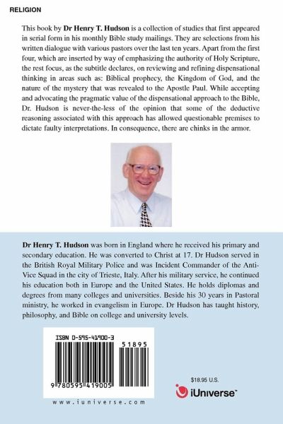 This book by Dr Henry T. Hudson is a collection of studies that first appeared in serial form in his monthly Bible study mailings. They are selections from his written dialogue with various pastors over the last ten years. Apart from the first four, which are inserted by way of emphasizing the authority of Holy Scripture, the rest focus, as the subtitle declares, on reviewing and refining dispensational thinking in areas such as: Biblical prophecy, the Kingdom of God, and the nature of the mystery that was revealed to the Apostle Paul. While accepting and advocating the pragmatic value of the dispensational approach to the Bible, Dr. Hudson is never-the-less of the opinion that some of the deductive reasoning associated with this approach has allowed questionable premises to dictate faulty interpretations. In consequence, there are chinks in the armor.