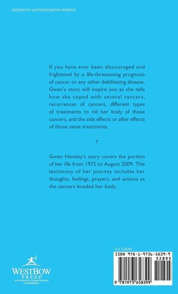 If you have ever been discouraged and frightened by a life-threatening prognosis of cancer or any other debilitating disease, Gwen's story will inspire you as she tells how she coped with several cancers, recurrences of cancers, different types of treatments to rid her body of those cancers, and the side effects or after effects of those same treatments. Gwen Hensley's story covers the portion of her life from 1975 to August 2009. This testimony of her journey includes her thoughts, feelings, prayers, and actions as the cancers invaded her body.