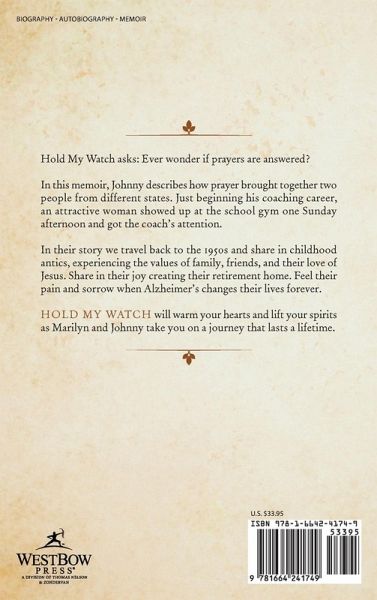 Hold My Watch asks: Ever wonder if prayers are answered? In this memoir, Johnny describes how prayer brought together two people from different states. Just beginning his coaching career, an attractive woman showed up at the school gym one Sunday afternoon and got the coach's attention. In their story we travel back to the 1950s and share in childhood antics, experiencing the values of family, friends, and their love of Jesus. Share in their joy creating their retirement home. Feel their pain and sorrow when Alzheimer's changes their lives forever. Hold My Watch will warm your hearts and lift your spirits as Marilyn and Johnny take you on a journey that lasts a lifetime.