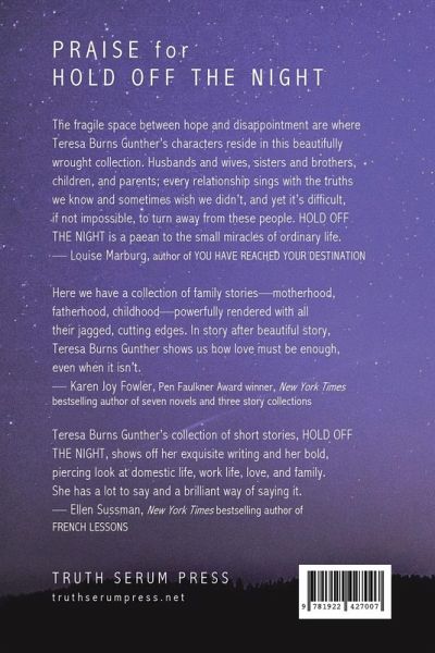 'Hold Off the Night''s twelve stories find people wrestling with the difficulties inherent in composing a life, navigating change, and salvaging relationships. These stories explore the difficulties of life inherent in families and relationships, complicated by class and faith, fear and loyalty, and longings that resonate with the broader human experience. Evelyn runs away from her fracturing life to a forgotten refuge while Jennifer finds herself in danger with a student's father who is not the charming man about whom she's fantasized. A musician strives to resolve his relationship with his father, complicated by his mother's mental illness, on the holiday that broke the family apart. Nine-year-old Jessie's loyalties are tested when "Daddy" returns to the roadside motel she runs with her mother in Texas. A mother in a claustrophobic home awaits news from her son in Afghanistan in a world that's forgotten the war. A homeless man causes a young mother to chafe at the edges of her narrow life and behave in surprising ways while ten-year-old Toni is made to understand class on her troubled family's camping vacation. After being laid off from the Ford plant, Bill sets off across country in search of his ex-wife who ran off with his son and finds truths about himself in the bargain. A widowed father tries desperately to connect with his troubled daughter. Joan struggles to emulate her patron saint while balancing her resentment and compassion toward the troubled foster child who's invaded her too-crowded home. Finally, a Jack Mormon is visited by missionaries who try to pray her back into the fold, forcing her to confront her place in a church and a family she believes complicit in her terrible loss.