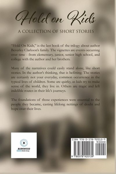 "Hold on Kids" is the last book of the trilogy about author Beverley Clarkson's family. The vignettes are events occurring over time - from elementary, junior, senior high school, and college with the author and her brothers. Many of the narratives could easily stand alone, like short stories. In the author's thinking, that is befitting. The stories are certainly not your everyday, common occurrence in the typical lives of children. Some are quirky, as kids try to make sense of the world, they live in. Others are tragic and left indelible routes in their life's journeys. The author has also included the early years of her marriage, professional life as a teacher and school administrator, and family times with her brothers. The foundations of those experiences were essential to the people they became, casting lifelong nettings of doubt and hope over their lives.