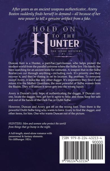 After years as an ancient weapons authenticator, Avery Beaton suddenly finds herself in demand-all because of her new power to tell a genuine artifact from a fake. Duncan Kerr is a Hunter, a part-Fae/part-human, who helps protect the modern world from the parallel universe where the Sidhe live. His family has been searching for an ancient knife for centuries. A weapon that in the Sidhe Realm can cut through anything-including rock. It's priority one they recover it, and they're closing in on its location. Big problem. To everyone except Avery, it looks like any other dagger. It's imperative they find it and return it to the Mother Guardians, the most powerful of Sidhe women from the Realm. They will assure it never gets into the wrong hands. Avery is Duncan's only hope of authenticating the dagger. If Duncan can: one, locate the dagger; two, get her to agree to help; and three, keep her safe and out of the hands of the Dark Fae or Dubh Sidhe. However, Duncan and Avery got off on the wrong foot. Then there is the powerful Dubh Sidhe king who wants to force Avery to find the dagger, and other items, for him. One who wants Duncan out of the picture. HUNTERS: Men and women who protect the world from things that go bump in the night. A full-length, stand-alone romance with paranormal & fantasy elements. No cliffhanger. HEA. @264 pgs