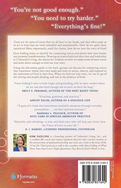You're not good enough. You need to try harder. Everything's fine! These are the sorts of voices that we all have in our heads, and they often push us to act in ways that are both unhelpful and unsustainable. How do we quiet these narratives? More importantly, amid the chatter, how do we hear the voice of God? Gem Fadling helps us identify the competing voices and shows how they hinder our personal transformation. Drawing on years of spiritual direction and leadership at Unhurried Living, she shares her wisdom of how we make sense of inner voices and settle down enough to find our true voice. Using the discussion guide in the back of the book, groups can discuss the competing voices that they experience within their own souls and learn to notice, discern, and respond to the movement of God in their lives. When we find our true voice, we can let go of the striving and people-pleasing and rest in the presence of God and his plan for our lives.