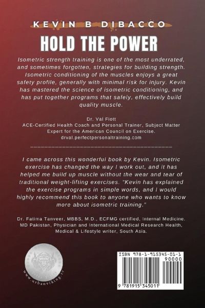 Isometric strength training is one of the most underrated, and sometimes forgotten, strategies for building strength. Isometric conditioning of the muscles enjoys a great safety profile, generally with minimal risk for injury. Kevin has mastered the science of isometric conditioning, and has put together programs that safely, effectively build quality muscle. Dr. Val Fiott ACE-Certified Health Coach and Personal Trainer, Subject Matter Expert for the American Council on Exercise. drval.perfectpersonaltraining.com ________________________________________ I came across this wonderful book by Kevin. Isometric exercise has changed the way I work out, and it has helped me build up muscle without the wear and tear of traditional weight-lifting exercises. "Kevin has explained the exercise programs in simple words, and I would highly recommend this book to anyone who wants to know more about isometric training." Dr. Fatima Tanveer, MBBS, M.D., ECFMG certified, Internal Medicine. MD Pakistan, Physician and International Medical Research Health, Medical & Lifestyle writer, South Asia.