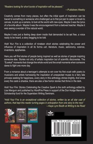 "Readers looking for short bursts of inspiration will be pleased."-Publishers Weekly Creativity comes from many places, but often the initial spark of inspiration can be traced to something or someone who challenged us to first put pen to paper or brush to canvas, to pick up a camera, to look at the world with new eyes. Maybe it was the lyrics of a favorite album. Maybe it was the encouragement from a beloved teacher. Maybe it was seeing a wonder of the natural world. Maybe it was just a feeling deep down inside that demanded to be set free, a voice ready to be heard, a story begging to be told. Hold Your Fire is a collection of nineteen short stories celebrating the power and influence of inspiration in all its forms-art, literature, music, astronomy, science, inventions, epiphanies. Here you will find stories of people being inspired as well as stories of people inspiring someone else. Stories not only of artistic inspiration but of scientific discoveries. The "Eureka!" moments that change the whole world and the small moments when someone dares to fight one more day. From a romance about a teenager's attempts to win over his first crush with poetry to musicians and artists harnessing the inspiration of unexpected muses to a fairy tale princess seeking for happiness, every story in this anthology shines brightly. And since every fire casts a shadow, there are also a few horror stories that thrive in the dark. Hold Your Fire: Stories Celebrating the Creative Spark is the sixth anthology edited by Lisa Mangum and published by WordFire Press in support of the Don Hodge Memorial Scholarship fund for the Superstars Writing Seminars. "Hold Your Fire is an exceptional collection of stories, written by an all star cast of authors, that kept this reader turning pages in anticipation from one story to the next."-Kaye Lynn Booth at Writing to be Read