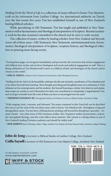 Holding Forth the Word of Life is a collection of essays offered to honor Tim Meadowcroft on his retirement from Laidlaw College. An international authority on Daniel, over the last twenty-five years Tim has established himself as one of New Zealand's leading biblical scholars. While specializing in Old Testament, Tim has taught and published in New Testament as well as hermeneutics and theological interpretation of Scripture. Beyond academic work he has also remained committed to the church and its voice in wider society. This collection of essays, written by leading scholars from New Zealand and beyond, covers all of these areas--Old Testament, New Testament, intertestamental texts, hermeneutics, theological interpretation of Scripture, reception history, and theological reflection on pressing issues facing society.