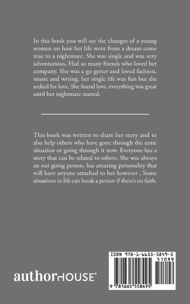 In this book you will see the changes of a young women on how her life went from a dream come true to a nightmare. She was single and was very adventurious, Had so many friends who loved her company. She was a go getter and loved fashion, music and wrting. her single life was fun but she seeked for love, She found love, everything was great until her nightmare started.
