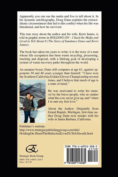 Apparently you can sue the Mafia and live to tell about it. In his dynamic autobiography, Doug Dane explains the extraordinary circumstances that led to this conflict when his life was threatened, and how he survived. This true story about the author and his wife, Kerri James, is told in graphic terms in HOLDING ON - I Sued the Mafia and Lived to Tell About It (The Story of Sundance Dane and Kerri James). The book took ten years to write. It is the story of a man whose life occupation had been waste recycling, processing, trucking and disposal, with a lifelong goal of developing a system of waste recovery parks throughout the world. An amateur boxer, Dane still competed at age 61, against opponents 30 and 40 years younger than himself. "I have won the Southern California Golden Gloves Championship several times, and I believe that much of age is a state of mind." He was motivated to write his memoir by the brave people who, no matter what the cost, never give up, and "when I re-met my first love." About the Author: Originally from Grand Rapids, Michigan, first-time author Doug Dane now resides with his wife in Santa Barbara, California. Publisher's website: http://www.strategicpublishinggroup.com/title/HoldingOn-ISuedTheMafiaAndLivedToTellAboutIt.html