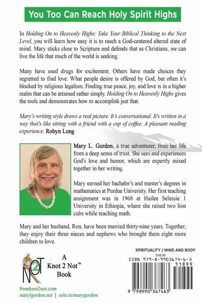 Holding On to Heavenly Highs, Take Your Biblical Thinking to the Next Level includes how to know God wants to spend time with you, how to be sure you're tapping in to His presence, and how to gain access to God's spiritual realm. Maintaining God-encounters is a major theme of this book. You will also learn how to gain momentum in your prayer life and even how to recognize God's fun side. Many have used drugs for excitement. Others have made choices they regretted to find love. What people desire is offered by God, but often it's blocked by religious legalism. Finding true peace, joy, and love is in a higher realm that can be attained rather simply. Holding On to Heavenly Highs gives the tools and demonstrates how to accomplish just that. You will learn how easy it is to reach a God-centered altered state of mind. Mary L. Gordon sticks close to Scripture and defends that, as Christians, we can live the life that much of the world is seeking. Your mind has high ability, much of which is untapped, and when God Himself is behind you enforcing the thoughts you hold, watch out! Overview: Chapters 1&2 cover definitions and examples of reaching heavenly highs. Chapter 3 emphasizes God's desire for our companionship with Him. Chapter 4 shows the literalness of the Bible. Chapter 5 explains how to have fun with it. Chapters 6-14 cover various exhortations related to the beauty of heavenly highs. Chapters 15-20 explain the methodology necessary for the desired outcome. Chapter 21 is an amazing example of how it all works. Chapters 22-27 give more insight into reaching and maintaining states of mind that lie within God's infinite joy. Chapter 28 portrays another example from my own experience. Chapter 29 demonstrates God's incredible mercy and ability to forgive. We need to know this to stay encouraged. Chapter 30 concludes the book with a bundle of joy to be imparted to the reader.