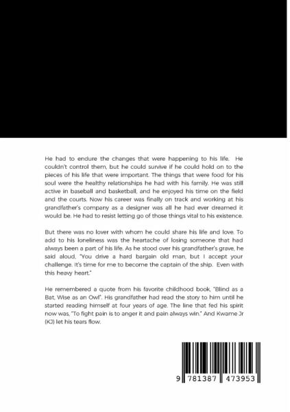 He had to endure the changes that were happening to his life. He couldn't control them, but he could survive if he could hold on to the pieces of his life that were important. The things that were food for his soul were the healthy relationships he had with his family. He was still active in baseball and basketball, and he enjoyed his time on the field and the courts. Now his career was finally on track and working at his grandfather's company as a designer was all he had ever dreamed it would be. He had to resist letting go of those things vital to his existence. But there was no lover with whom he could share his life and love. To add to his loneliness was the heartache of losing someone that had always been a part of his life. As he stood over his grandfather's grave, he said aloud, "You drive a hard bargain old man, but I accept your challenge. It's time for me to become the captain of the ship, even with this heavy heart." He remembered a quote from his favorite childhood book, "Blind as a Bat, Wise as an Owl". His grandfather had read the story to him until he started reading himself at four years of age. The line that fed his spirit now was, "To fight pain is to anger it and pain always win." And Kwame Jr (KJ) let his tears flow.