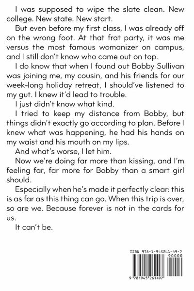 I was supposed to wipe the slate clean. New college. New state. New start. But even before my first class, I was already off on the wrong foot. At that frat party, it was me versus the most famous womanizer on campus, and I still don't know who came out on top. I do know that when I found out Bobby Sullivan was joining me, my cousin, and his friends for our week-long holiday retreat, I should've listened to my gut. I knew it'd lead to trouble. I just didn't know what kind. I tried to keep my distance from Bobby, but things didn't exactly go according to plan. Before I knew what was happening, he had his hands on my waist and his mouth on my lips. And what's worse, I let him. Now we're doing far more than kissing, and I'm feeling far, far more for Bobby than a smart girl should. Especially when he's made it perfectly clear: this is as far as this thing can go. When this trip is over, so are we. Because forever is not in the cards for us. It can't be.