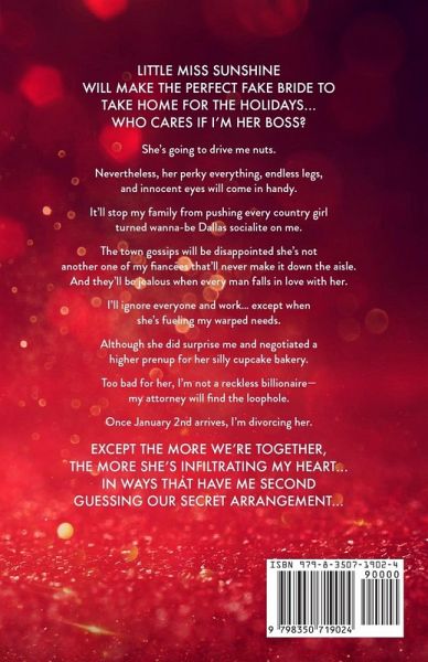 Little Miss Sunshine will make the perfect fake bride to take home for the holidays... who cares if I'm her boss? She's going to drive me nuts. Nevertheless, her perky everything, endless legs, and innocent eyes will come in handy. It'll stop my family from pushing every country girl turned wanna-be Dallas socialite on me. The town gossips will be disappointed she's not another one of my fiancées that'll never make it down the aisle. And they'll be jealous when every man falls in love with her. I'll ignore everyone and work... except when she's fueling my warped needs. Although she did…mehr