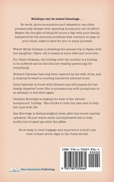 Holidays can be mixed blessings. . . . No work, glorious sunshine and relaxation can often precariously seesaw with spending money you can ill afford. Maybe the thought of being 24 hours a day with your family, hampered by the personal problems that continue to play on your mind, make it hard for you to enjoy yourself. Widow Molly Graham is dreading the annual trip to Spain with her daughter, Claire. All it means is more debt and more lies. For Claire Graham, the holiday with her mother is a holiday to be suffered and so she lets her wealthy parent pay for everything. Richard Calendar has long been rejected by his wife, Dora, and is looking forward to meeting his secret internet lover. Dora Calendar is bored with Richard and still yearns for her dearly departed lover. She is promiscuous with young men in an attempt to feel alive again. Caroline Kerridge is making the best of the 'second honeymoon' holiday. She drinks to hide her pain and to help her cope with life. Ben Kerridge is feeling weighed down after his recent marital upheaval. He just wants some uncomplicated sex to help soothe his bruised ego after the affair. Stow away in their luggage and experience a bird's eye view of their seven days in the Costa del Sol.