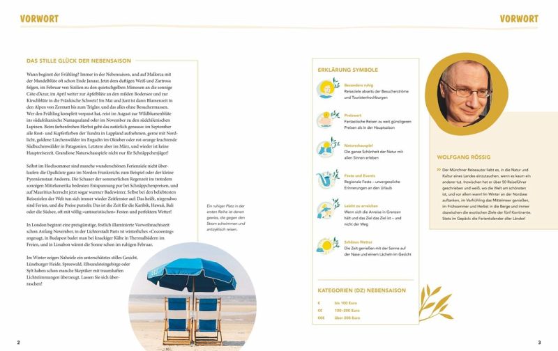 Reisen kann so einfach sein: Die Altstadt angenehm leer, der Dschungel vom warmen Regenschauer erfrischt, das schicke Boutiquehotel um ein Drittel günstiger. Oft bieten unterschätzte Reisezeiten neue Perspektiven - wenn Nebelschwaden Venedig in ein unwirkliches Zwielicht hüllen, wenn der Goldene Oktober die Täler Südtirols zum Leuchten bringt, bevor die Wintersportler einfallen und nachdem sich die Sommertouristen verabschiedet haben. Oder wenn man dem nasskalten Februar durch eine Flucht in die Karibik entgeht, die zu dieser Zeit herrlich untouristisch ist, dann ist die perfekte Reisezeit. Denn: Wer zu außergewöhnlichen Zeiten reist, macht außergewöhnliche Erfahrungen. Ganz entspannt.