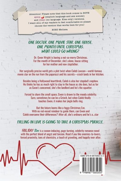#1 Amazon Bestseller Please note-this book is offered in TWO different versions: 1) A spicy/open-door version with mild explicit language and sex scenes 2) A sweet/clean/closed-door version with no language and only kissing. I want ALL of my readers to feel comfortable, so please choose the best version for you. One doctor. One movie star. One house. What could go wrong? When Dr. Gwen Wright agrees to house sit for her mother in Los Angeles, she has no idea that her surgically precise world is about to get a major plot twist. It's Caleb Lawson-world-famous movie star on the run from the paparazzi and his secrets-who crash lands in her kitchen. Besides being a Hollywood heartthrob, Caleb is also her new stepdad's nephew. He thinks he has as much right to stay in the house as she does, but, as far as Gwen's concerned, she's the landlord and he's the squatter. Forced to share the small space, Gwen is drawn to the moody celebrity. But falling for a star is a risky business. Especially when there's an army of paparazzi on his tail... Holiday Star is a swoon-inducing, page-turning, celebrity romance novel with the perfect blend of angst and tension. Read if you like enemies-to-lovers, forced proximity, tons of chemistry, a touch of groveling, and happily ever after. Perfect for fans of Emily Henry, Lucy Score, Tessa Bailey, and Sophie Lark. Editorial review for Holiday Star: "The pace was fast, the descriptions were exciting, the plot was interesting, the dialogues were hilarious, and the overall feel of the novel was outstanding. This novel highly deserves it's 5 stars from me."- Rabia Tanveer, Reader's Favorite. ¿¿¿¿¿ ¿¿¿¿¿¿¿ Holiday Star has captured the hearts of readers! "This is hands down the one of the best, most emotionally charged, and close to real life romance book I have ever read." - Julia ¿¿¿¿¿ "The kind of book that leaves you missing the characters when you're done as if they are your own friends/family. I LOVED it!" - Amazon Customer ¿¿¿¿¿ "Caleb is a totally swoon-worthy MMC. I'm not surprised he swept Gwen off her feet because he did the same to me." - Chloe ¿¿¿¿¿ "I'm STILL thinking about it. The dynamic between Caleb and Gwen made me all giddy inside." - Lisa ¿¿¿¿¿ "I had heard that this book was amazing on TikTok and it really blew me out of the water." - Mamareads321 ¿¿¿¿¿