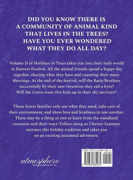 Did you know there is a community of animal kind that lives in the trees? Have you ever wondered what they do all day? Volume II of Holidays in Trees takes you into their leafy world in Harvest Festival. All the animal friends spend a happy day together, sharing what they have and counting their many blessings. At the end of the festival, will the Batty Brothers successfully fly their new invention they call a kyte? Will the Crows want this kyte up in their sky territory? These forest families only use what they need, take care of their environment, and show love and kindness to one another. There may be a thing or two to learn from the woodland creatures and their ways! Follow along as Chester Scamper narrates this holiday tradition and takes you on an exciting autumnal adventure.