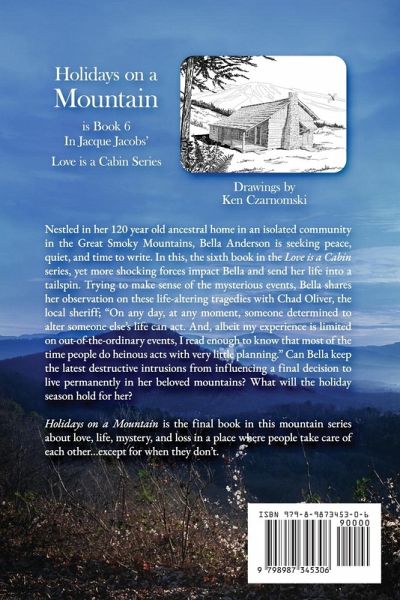 Nestled in her 120 year old ancestral home in an isolated community in the Great Smoky Mountains, Bella Anderson is seeking peace, quiet, and time to write. In this, the sixth book in the Love is a Cabin series, yet more shocking forces impact Bella and send her life into a tailspin. Trying to make sense of the mysterious events, Bella shares her observation on these life-altering tragedies with Chad Oliver, the local sheriff; "On any day, at any moment, someone determined to alter someone else's life can act. And, albeit my experience is limited on out-of-the-ordinary events, I read enough to know that most of the time people do heinous acts with very little planning." Can Bella keep the latest destructive intrusions from influencing a final decision to live permanently in her beloved mountains? What will the holiday season hold for her? Holidays on a Mountain is the final book in this mountain series about love, life, mystery, and loss in a place where people take care of each other...except for when they don't.