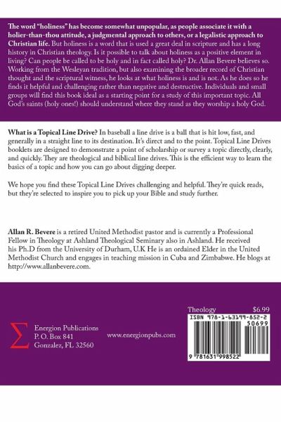 The word "holiness" has become somewhat unpopular, as people associate it with a holier-than-thou attitude, a judgmental approach to others, or a legalistic approach to Christian life. But holiness is a word that is used a great deal in scripture and has a long history in Christian theology. Is it possible to talk about holiness as a positive element in living? Can people be called to be holy and in fact called holy? Dr. Allan Bevere believes so. Working from the Wesleyan tradition, but also examining the broader record of Christian thought and the scriptural witness, he looks at what holiness is and is not. As he does so he finds it helpful and challenging rather than negative and destructive. Topical Line Drive volumes are intended to point you to the basics and provide a start for deeper study. Individuals and small groups will find this book ideal as a starting point for a study of this important topic. All God's saints (holy ones!) should understand where they stand as they worship a holy God.