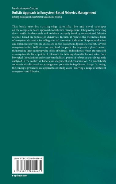 This book provides cutting-edge scientific idea and novel concepts on the ecosystem-based approach to fisheries management. It begins by reviewing the scientific fundamentals and problems currently faced by conventional fisheries science, based on population dynamics. In turn, it reviews the theoretical basis of ecosystem dynamics, including selected ecosystem indicators. Surplus production and balanced harvests are discussed in the ecosystem dynamics context. Several ecosystem-holistic indicators are described, but particular emphasis is placed on two: the noxicline (gain in entropy due to loss of biomass) and resilience, which are expressed as ecosystem (holistic) points of reference for defining allowable harvest rates. Both biological (population) and ecosystem (holistic) points of reference are subsequently analyzed in the context of fisheries management and conservation. An adaptability concept is also discussed as a management policy for facing climate change. In closing, the concepts presented are applied to six study cases involving a range of different ecosystems and fisheries.