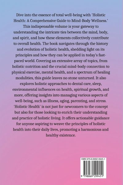 "Holistic Health: A Comprehensive Guide to Mind-Body Wellness" is an essential read for anyone seeking to enhance their well-being through a holistic approach. This book delves into the interconnectedness of the mind, body, and spirit, offering readers a deep understanding of holistic health principles and practices. From historical perspectives to modern applications, it covers a wide range of topics including holistic nutrition, the mind-body connection, exercise, mental health, healing modalities, dentistry, sleep, environmental wellness, and spiritual well-being. Additionally, it addresses holistic perspectives on illness and disease, women's and men's health, aging, parenting, education, weight management, stress management, and even holistic travel. Whether you're new to the concept of holistic health or looking to deepen your knowledge, this guide provides practical advice and insights for integrating holistic principles into everyday life, fostering a balanced and healthy lifestyle.