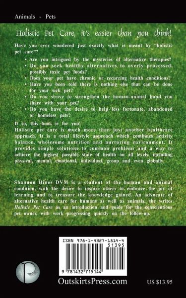 Holistic Pet Care, it's easier than you think! Have you ever wondered just exactly what is meant by "holistic pet care"? * Are you intrigued by the mysteries of alternative therapies? * Do you seek healthy alternatives to overly processed, possibly toxic pet foods? * Does your pet have chronic or recurring health conditions? * Have you been told there is nothing else that can be done for your sick pet? * Do you strive to strengthen the human-animal bond you share with your pet? * Do you have the desire to help less fortunate, abandoned or homeless pets? If so, this book is for you! Holistic pet care is much more than just another healthcare approach. It is a total lifestyle approach which combines activity balance, wholesome nutrition and nurturing environment. It provides simple solutions to common problems and a way to achieve the highest possible state of health on all levels, including physical, mental, emotional, individual, group and even globally.