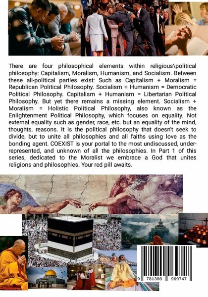 There are four philosophical elements within religious\political philosophy: Capitalism, Moralism, Humanism, and Socialism. Between these all-political parties exist: Such as Capitalism + Moralism = Republican Political Philosophy. Socialism + Humanism = Democratic Political Philosophy. Capitalism + Humanism = Libertarian Political Philosophy. But yet there remains a missing element. Socialism + Moralism = Holistic Political Philosophy, also known as the Enlightenment Political Philosophy, which focuses on equality. Not external equality such as gender, race, etc. but an equality of the mind, thoughts, reasons. It is the political philosophy that doesn't seek to divide, but to unite all philosophies and all faiths using love as the bonding agent. COEXIST is your portal to the most undiscussed, under-represented, and unknown of all the philosophies. In Part 1 of this series, dedicated to the Moralist we embrace a God that unites religions and philosophies. Your red pill awaits.