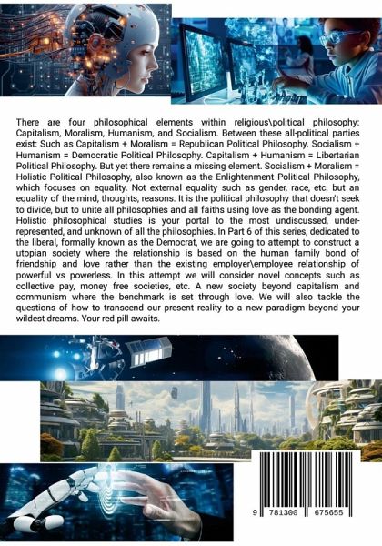 There are four philosophical elements within religious\political philosophy: Capitalism, Moralism, Humanism, and Socialism. Between these all-political parties exist: Such as Capitalism + Moralism = Republican Political Philosophy. Socialism + Humanism = Democratic Political Philosophy. Capitalism + Humanism = Libertarian Political Philosophy. But yet there remains a missing element. Socialism + Moralism = Holistic Political Philosophy, also known as the Enlightenment Political Philosophy, which focuses on equality. Not external equality such as gender, race, etc. but an equality of the mind, thoughts, reasons. It is the political philosophy that doesn't seek to divide, but to unite all philosophies and all faiths using love as the bonding agent. Holistic philosophical studies is your portal to the most undiscussed, under-represented, and unknown of all the philosophies. In Part 6 of this series, dedicated to the liberal, formally known as the Democrat, we are going to attempt to construct a utopian society where the relationship is based on the human family bond of friendship and love rather than the existing employer\employee relationship of powerful vs powerless. In this attempt we will consider novel concepts such as collective pay, money free societies, etc. A new society beyond capitalism and communism where the benchmark is set through love. We will also tackle the questions of how to transcend our present reality to a new paradigm beyond your wildest dreams. Your red pill awaits.