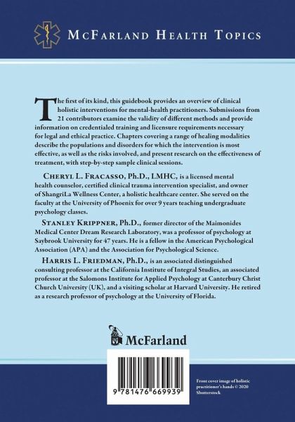The first of its kind, this guidebook provides an overview of clinical holistic interventions for mental-health practitioners. Submissions from 21 contributors examine the validity of different methods and provide information on credentialed training and licensure requirements necessary for legal and ethical practice. Chapters covering a range of healing modalities describe the populations and disorders for which the intervention is most effective, as well as the risks involved, and present research on the effectiveness of treatment, with step-by-step sample clinical sessions.