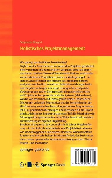 Wie gelingt ganzheitlicher Projekterfolg? Täglich wird in Unternehmen an tausenden Projekten gearbeitet. Viele von ihnen sind zum Scheitern verurteilt, bevor sie begonnen haben. Unklare Ziele und Verantwortlichkeiten, aneinander vorbei arbeitende Projektteams, internes Machtgerangel - so sieht es allzu oft hinter den Kulissen aus. Stephanie Borgert analysiert anschaulich, in welchen Fallstricken sich organisationale Projekte verfangen und zeigt Lösungen für erfolgreiche Veränderungen auf. Im Zentrum steht die ganzheitliche Sicht auf Projekte als komplexe dynamische Systeme (Makroebene), welche von Menschen mit Leben gefüllt werden (Mikroebene). Die Autorin verknüpft Erkenntnisse aus der Systemtheorie, der Hirnforschung so-wie dem Neuro-Linguistischen Programmieren (NLP) zu praktischen Werkzeugen und Methoden für die Projektarbeit. "Holistisches Projektmanagement" hält für Mitarbeiter wie Führungskräfte gleichermaßen Aha-Effekte bereit und motiviert zur Umsetzung im eigenen Projektalltag. Stephanie Borgert schöpft aus mehr als 15 Jahren Projekterfahrung - in der Rolle als Mitarbeiterin und Projektleiterin ebenso wie als Auftraggeberin und externe Beraterin. Wissenschaftlich fundiert und mit sehr hohem Praxistransfer, lädt das Buch ein zu einer neuen, spannenden Auseinandersetzung mit dem Thema Projekt- und Teamkultur.