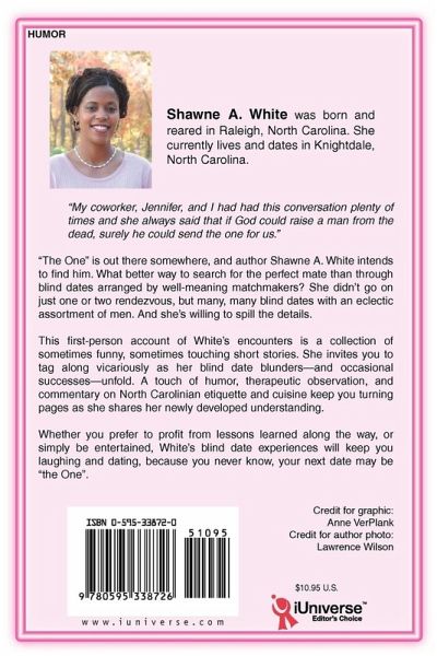 "My coworker, Jennifer, and I had had this conversation plenty of times and she always said that if God could raise a man from the dead, surely he could send the one for us." "The One" is out there somewhere, and author Shawne A. White intends to find him. What better way to search for the perfect mate than through blind dates arranged by well-meaning matchmakers? She didn't go on just one or two rendezvous, but many, many blind dates with an eclectic assortment of men. And she's willing to spill the details. This first-person account of White's encounters is a collection of sometimes funny, sometimes touching short stories. She invites you to tag along vicariously as her blind date blunders--and occasional successes--unfold. A touch of humor, therapeutic observation, and commentary on North Carolinian etiquette and cuisine keep you turning pages as she shares her newly developed understanding. Whether you prefer to profit from lessons learned along the way, or simply be entertained, White's blind date experiences will keep you laughing and dating, because you never know, your next date may be "the One".