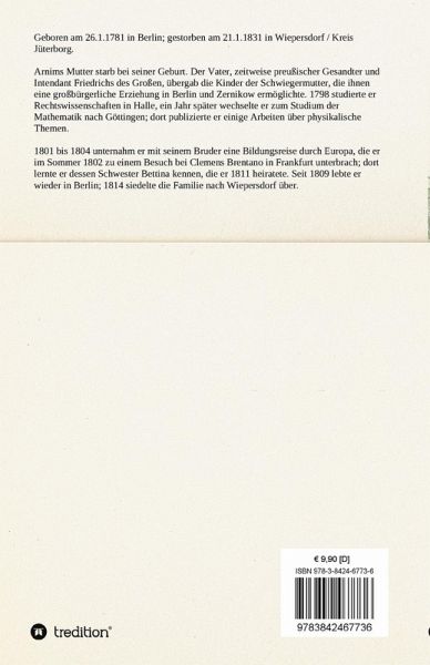 Geboren am 26.1.1781 in Berlin; gestorben am 21.1.1831 in Wiepersdorf / Kreis Jüterborg. Arnims Mutter starb bei seiner Geburt. Der Vater, zeitweise preußischer Gesandter und Intendant Friedrichs des Großen, übergab die Kinder der Schwiegermutter, die ihnen eine großbürgerliche Erziehung in Berlin und Zernikow ermöglichte. 1798 studierte er Rechtswissenschaften in Halle, ein Jahr später wechselte er zum Studium der Mathematik nach Göttingen; dort publizierte er einige Arbeiten über physikalische Themen. 1801 bis 1804 unternahm er mit seinem Bruder eine Bildungsreise durch Europa, die er im Sommer 1802 zu einem Besuch beiClemens Brentanoin Frankfurt unterbrach; dort lernte er dessen SchwesterBettinakennen, die er 1811 heiratete. Seit 1809 lebte er wieder in Berlin; 1814 siedelte die Familie nach Wiepersdorf über.